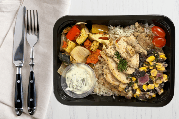 Tender chili-spiced chicken served over fragrant basmati rice with classic roasted vegetables, smoky corn and black bean salsa, and juicy grape tomatoes. Finished with a bright lime cilantro sauce and fresh herbs for a bold, fresh bowl with just the right kick