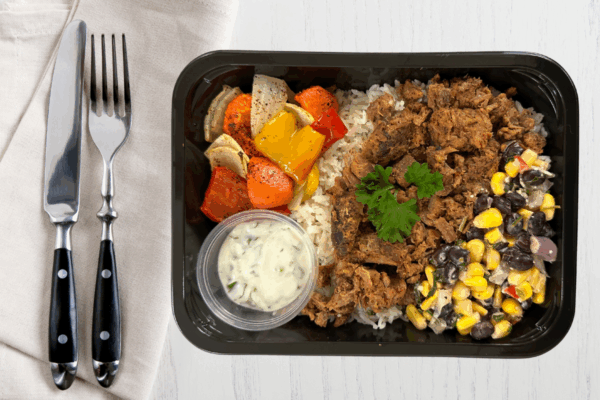 Slow-braised barbacoa beef served over fragrant cilantro lime jasmine rice with roasted peppers and onions, smoky corn and black bean salsa, and bright salsa verde. Rich, savoury, and deeply satisfying with fresh citrus and herb notes throughout.