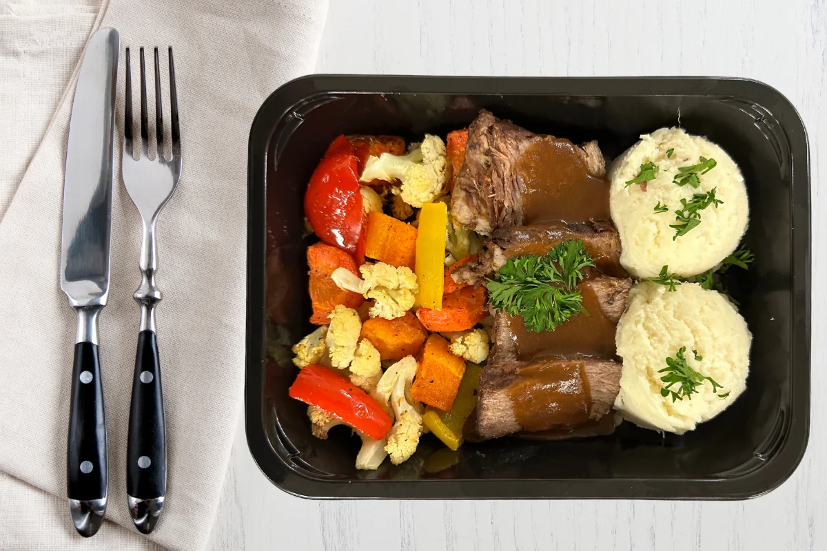 Slow-braised beef served with a rich red wine sauce, creamy garlic mashed potatoes, and classic roasted vegetables. Deep, savoury, and comforting, this bowl delivers elevated homestyle flavour with a hearty, satisfying finish.