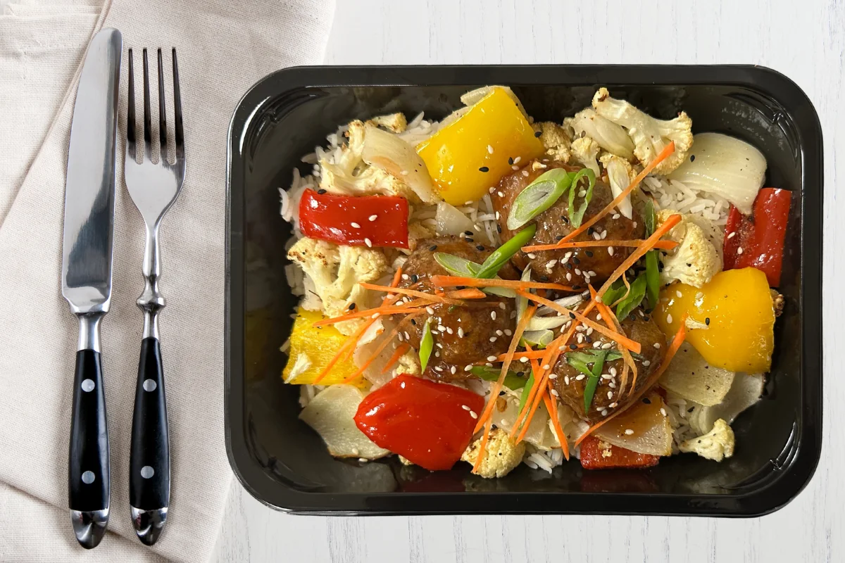 A lighter, low-carb take on our Sweet & Sour Turkey Meatball, featuring juicy sweet and sour turkey meatballs served over cauliflower rice with aromatic roasted vegetables and julienned carrots. Finished with green onions and toasted sesame seeds for bold, sweet-tangy flavour without the extra carbs.